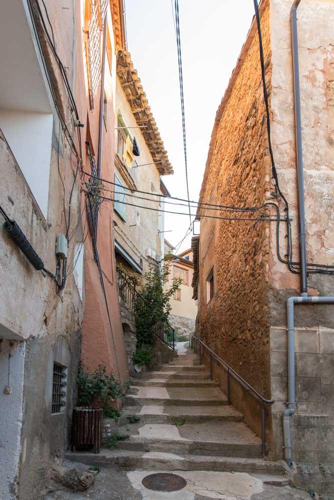 Las casas de mampuesto y tapial, se apiñan en estrechas y sinuosas calles adaptándose al pronunciado desnivel del terreno.
